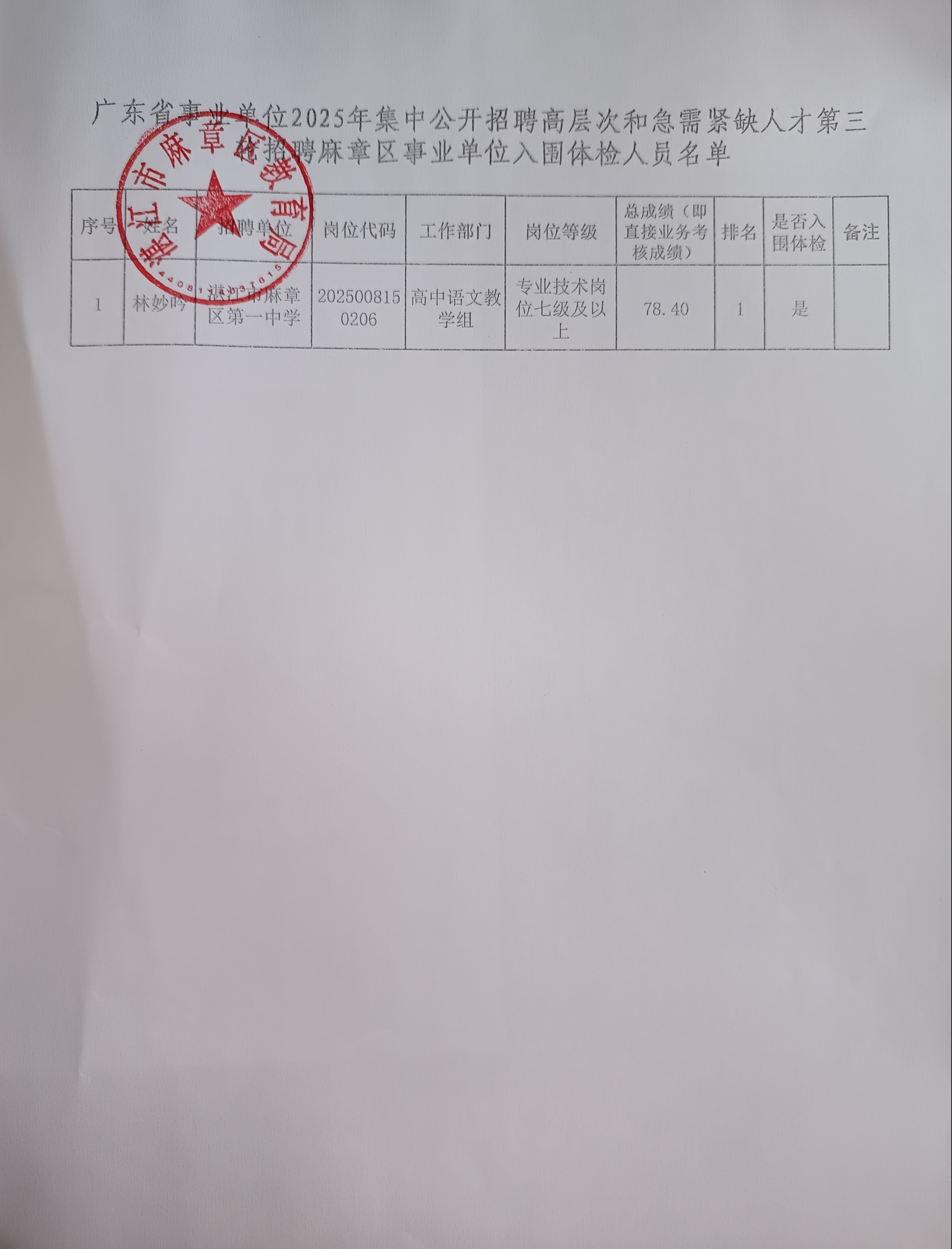 本次考试总成绩及入围体检名单见《广东省事业单位2025年集中公开招聘高层次和急需紧缺人才第三轮招聘麻章区事业单位入围体检人员名单》(附件1)。