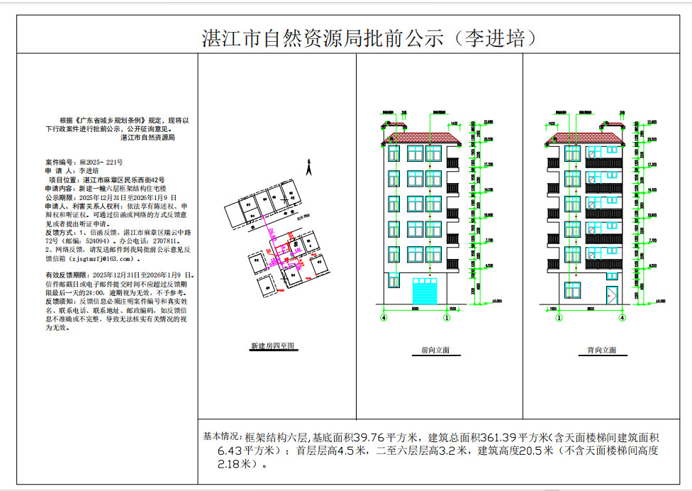 (李进培)核发一幢框架结构六层住宅楼《建设工程规划许可证》批前公示