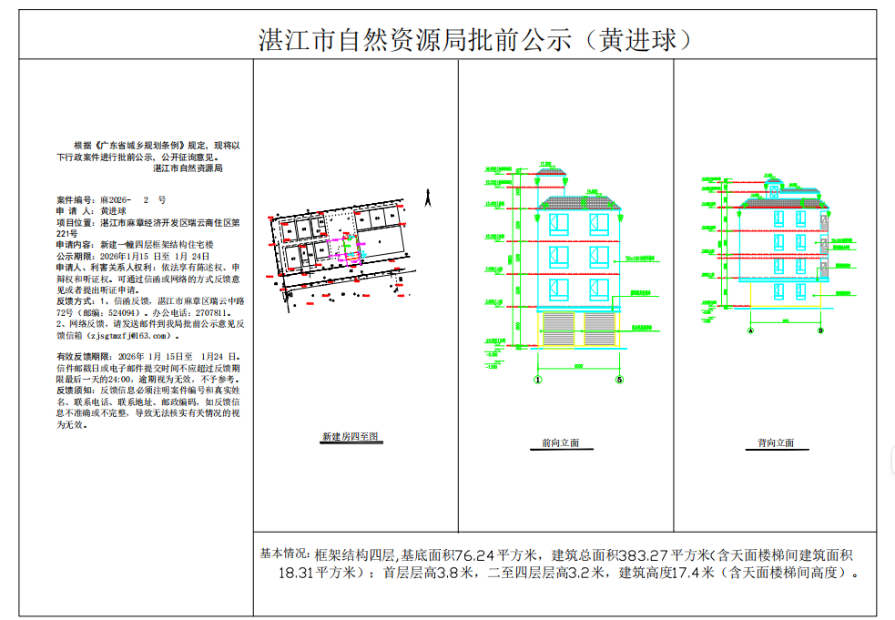 (黄进球)核发一幢框架结构四层住宅楼《建设工程规划许可证》批前公示