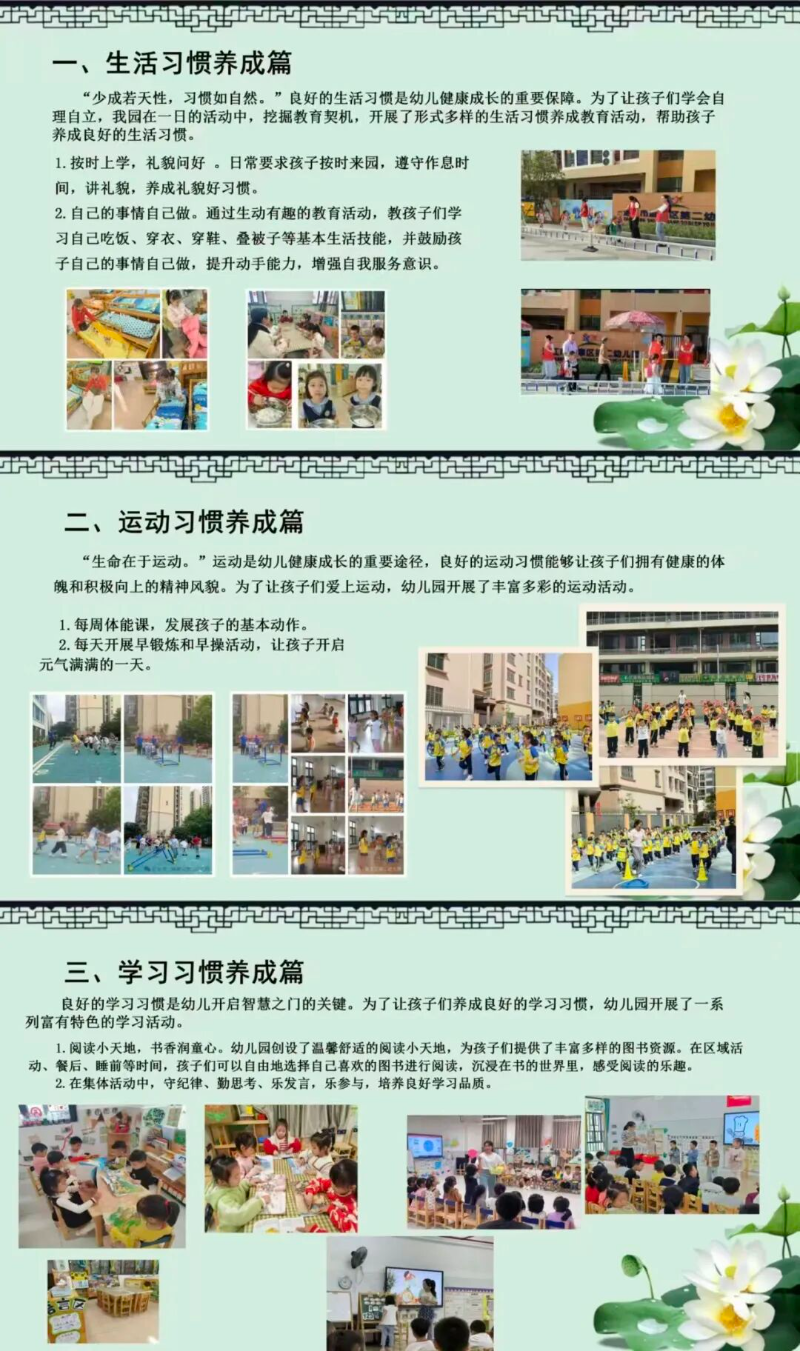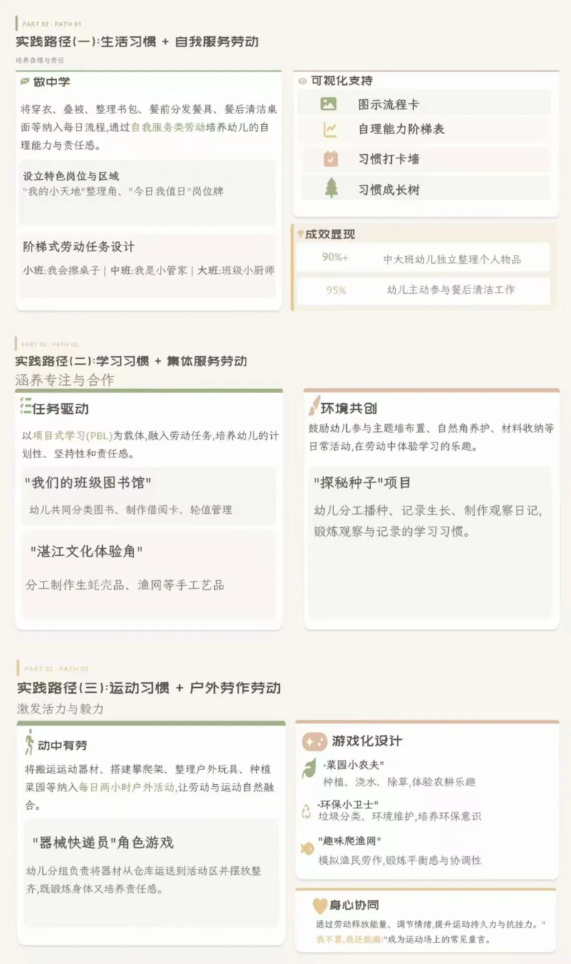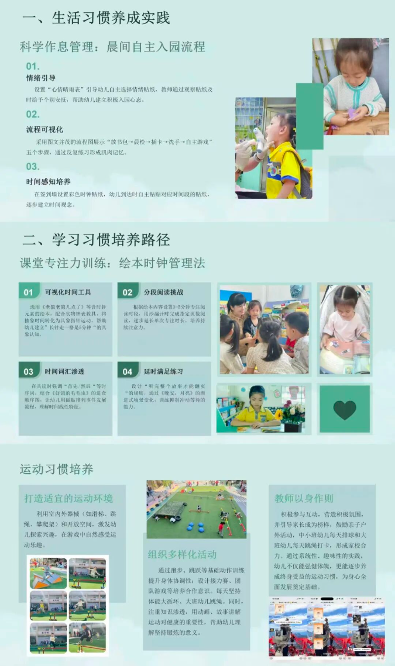 麻章区第一幼儿园以“活教育”理论为指导,系统规划实施路径。他们为三大习惯分别设定清晰目标与特色做法,如通过家庭运动打卡落实“活力童年”,通过值日生制度和种植园体验培育“自主乐劳”,通过绘本漂流和科学发现区激发“好奇探索”。这种系统化、目标化的推进方式,确保了习惯养成教育的科学性与实效性。