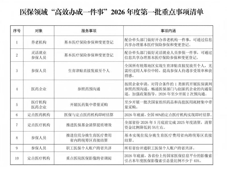 此外,清单明确,2026年底前,全国80%的定点医疗机构实现即时结算;至少开展一批次国家组织药品和高值医用耗材集中带量采购;基本实现住院分娩生育医疗费用省内跨统筹区直接结算。