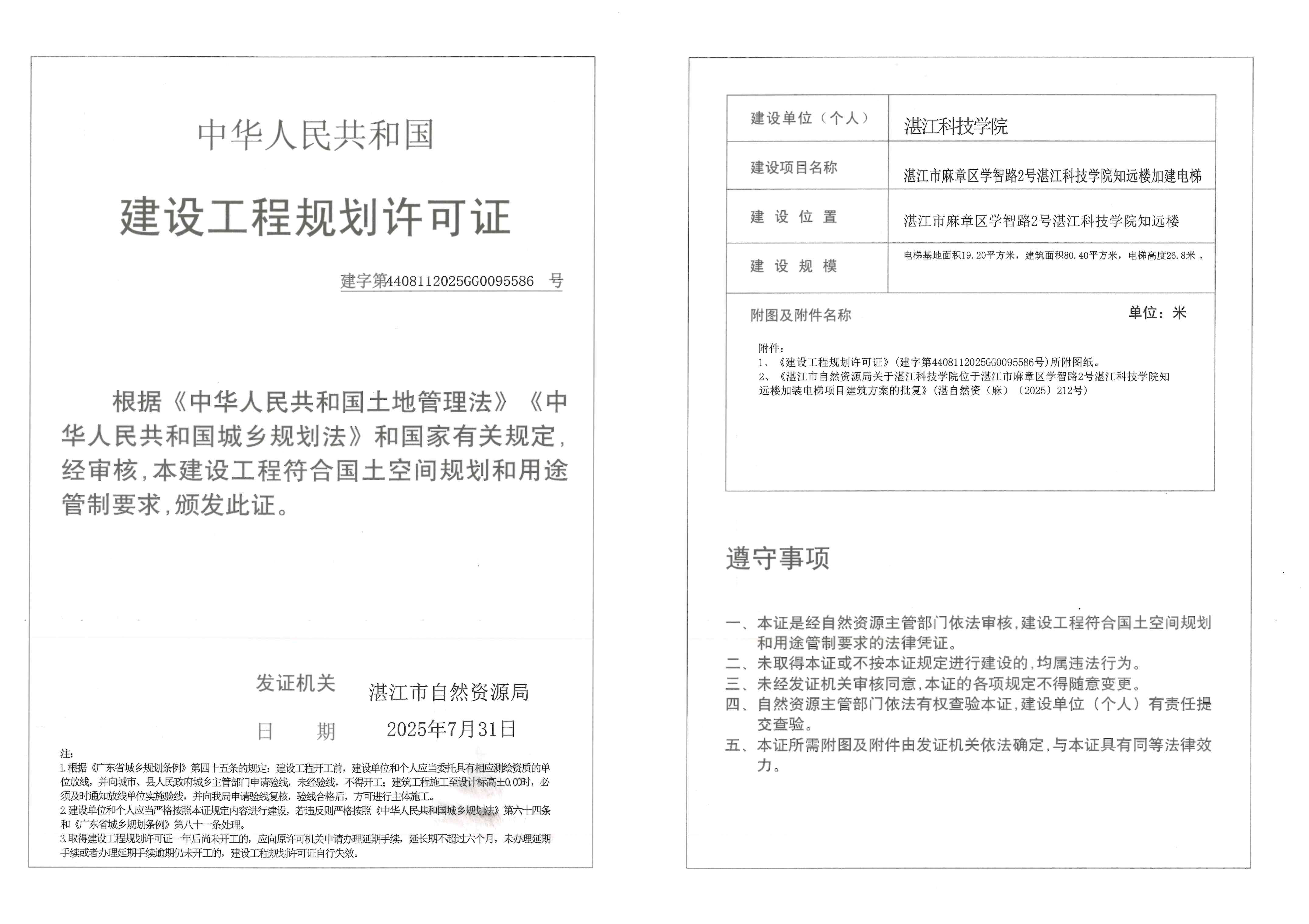(湛江市麻章区学智路2号湛江科技学院知远楼加建电梯))建设工程规划许可证