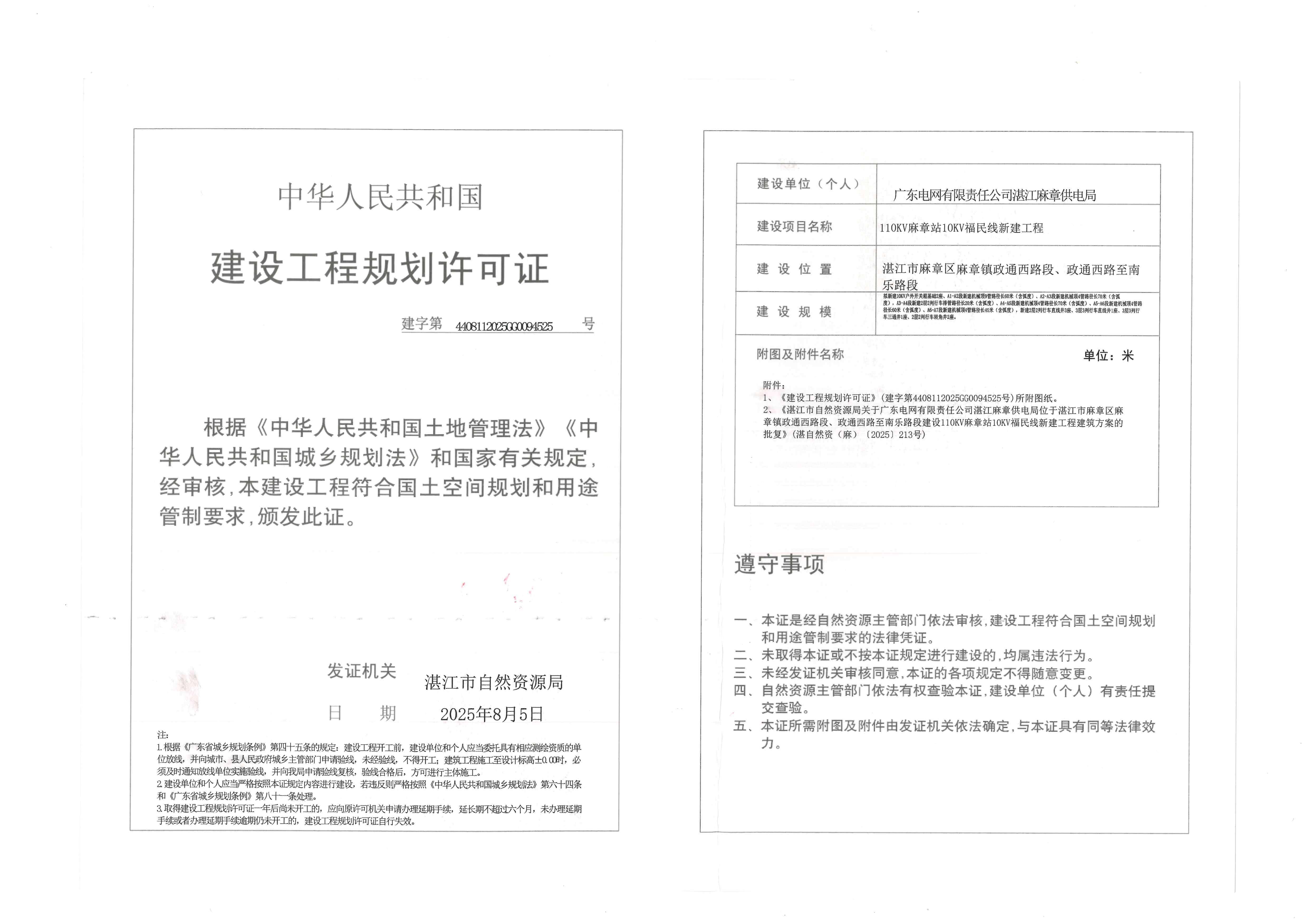 (110KV麻章站10KV福民线新建工程))建设工程规划许可证