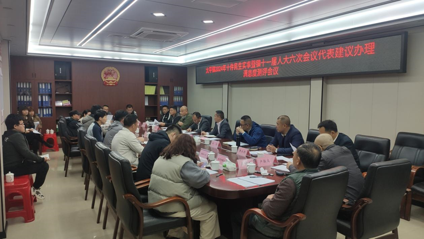 2024年12月27日上午,太平镇人大召开2024年十件民生实事和第十一届人大六次会议代表建议满意度测评会议。会议由镇人大主席陈源主持,提出建议的15名代表参加,建议办理的各职能部门主要负责同志列席会议。