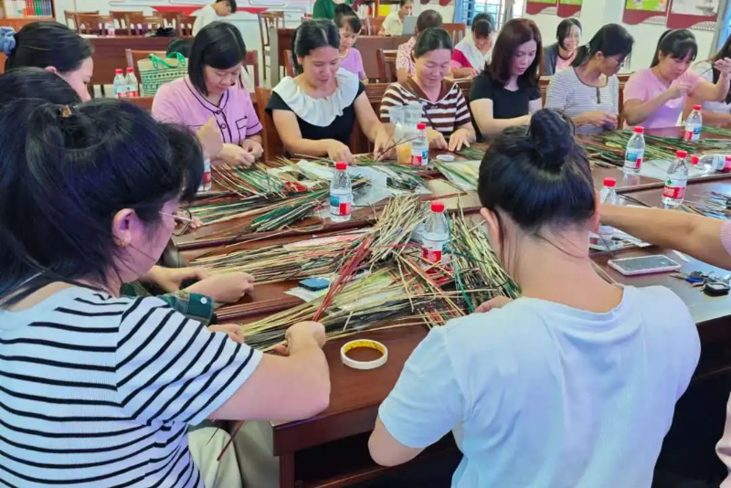 在老师的“手把手”指导下,学员们从最简单的挑、压、缠、绕等手法学起,开始尝试编织自己的作品。现场充满了欢声笑语,大家互相交流、互相帮助,一根根蒲草在指尖飞舞,逐渐呈现出各具特色的扇子模样。