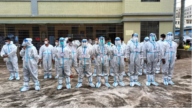 雷州港城老兵冯庆斌,是一位有着12年兵龄、等待安置的转业士官。这次,他听从组织的号召,舍下将要临产的妻子,毅然参加支援北和镇抗疫任务,战斗在最艰苦的抗疫前线。8月12日中午,他穿着防护服,在烈日下顽强坚守岗位,直至中暑晕倒,周聪队长闻讯,迅速带领医务人员赶到现场进行救援,直至其清醒脱险。冯庆斌清醒后,还要求继续站岗,但遭到周聪队长婉拒,随后周聪队长接替他上岗,并马上派车将他送至医院观察治疗。现在,冯庆斌已恢复健康,正在一线抗疫。吴川的骆嘉杰、李万洲等港城老兵,多次冒着酷热,顽强坚守工作岗位,好几次差点中暑昏倒,好在突然下雨,天气降温,最后化险为夷,但队员满脸都是汗水和雨水,全身都湿透了。