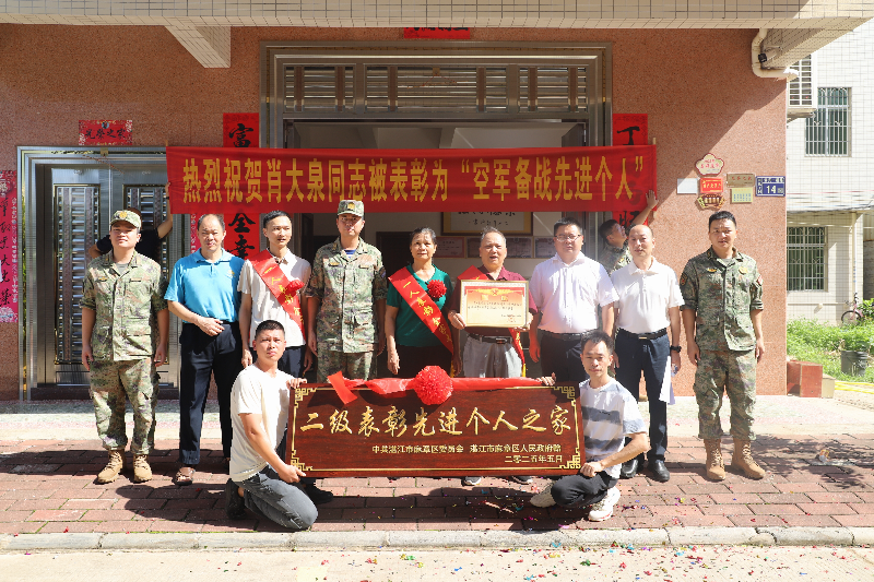 在铿锵的锣鼓声与阵阵鞭炮声中,送喜报队伍高举“二级表彰先进个人之家”烫金牌匾和醒目的报喜横幅,在父老乡亲的簇拥下,将承载着荣誉的喜报送到肖大泉家中。在喜庆与荣耀的氛围中,陈鹏宇满怀敬意地为军属们送上喜报、牌匾、绶带、慰问金,并与军属亲切交谈。“这份荣誉既是肖大泉同志刻苦训练、建功军营的见证,也是麻章子弟兵矢志强军的缩影。”陈鹏宇同志表示,肖大泉作为空军某部专业技术骨干,在部队某技术领域表现突出,展现出新时代革命军人的过硬本领和使命担当,是全区干部的学习榜样。