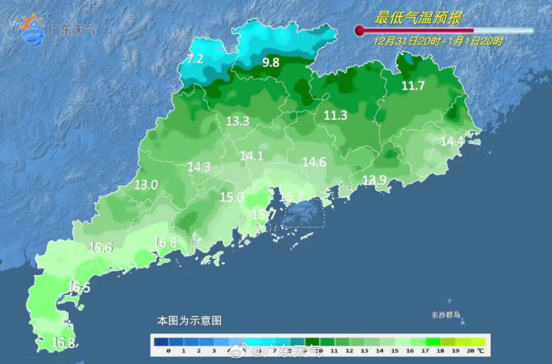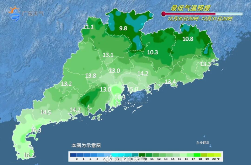 12月31日白天到夜间,粤西北、珠三角西部市县多云转阴天,有分散小雨,其余市县多云为主。最低气温:中北部和粤东北部市县9~13℃,粤西偏西市县15~18℃,其余市县13~15℃。