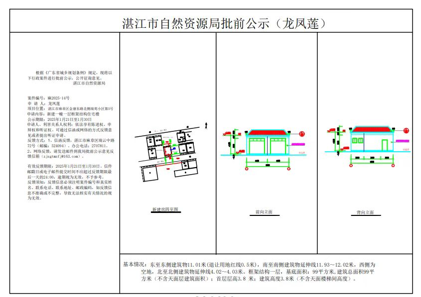 (龙凤莲)核发一幢框架结构一层住宅楼《建设工程规划许可证》批前公示